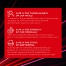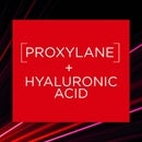 Image 1 - A red square with white text on a dark background with red and pink light streaks displays the text [PROXYLANE] + HYALURONIC ACID. Image 2 - A flat lay displays LOréal Revitalift Laser Renew skincare products including a red serum bottle, a red eye cream tube, and various red jars for face creams, with visible text LOREAL PARIS REVITA LIFT LASER RENEW, LOREAL PARIS REVITALIFT LASER RENEW / LASER X3 EYE CREAM, REVITALIFT LASER RENEW, OR, REVITALIFT LASER RENEW SPF 20, REVITALIFT LASER RENEW NIGHT, 1 SERUM, 2 EYE CREAM, 3 DAY CREAM, 4 NIGHT CREAM. Image 3 - A red infographic outlines product safety through three sections, featuring a magnifying glass icon and text SAFE IN THE THOROUGHNESS OF OUR TRIALS To ensure our active ingredients are safe for all skin types, we apply our formulas on real skin 600 times (before it goes anywhere near yours), an open cream jar icon and text SAFE IN THE STRENGTH OF OUR FORMULAS After we’ve tested the effectiveness of our products, they’re tested again independently (so we’re doubly sure), and a heart-shaped hands icon and text SAFE IN THE ETHICS OF OUR TESTING 30 years ago, we completely stopped testing our products on animals, years before it became law. We’ve even developed ground-breaking testing alternatives like Episkin; created with human skin cells.